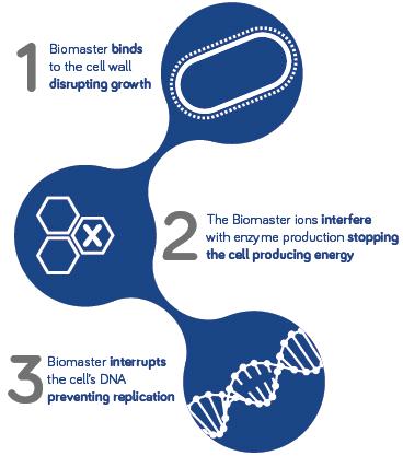 When bacteria come into contact with a Biomaster protected surface, the silver ions prevent bacteria from growing, producing energy or replicating, therefore they die.