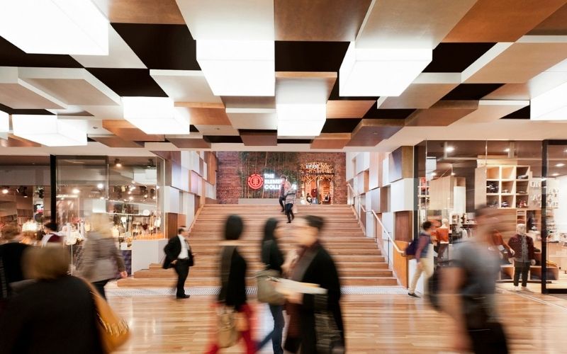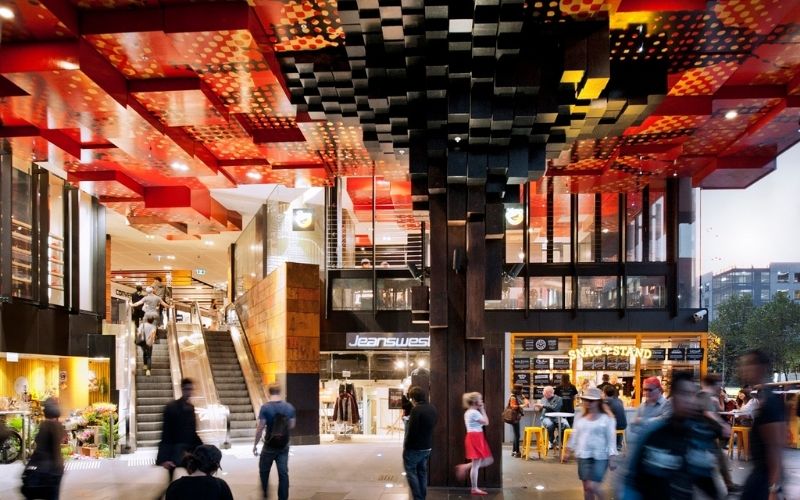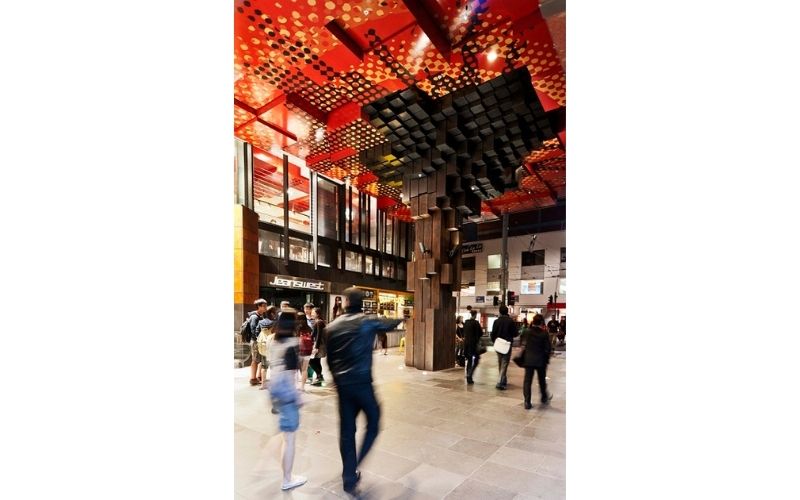 During the Melbourne Central redevelopment, Mirotone Wood Coatings were used to create a stunning effect in the semi exterior entry with MIROSTAIN stains in vibrant red, orange, black and brown. Inside stains in black beige, grey and brown create a mosaic effect on the walls and ceilings. MIROTHANE PU 5577 Sunshield Clear, polyurethane topcoat with UV absorbers provides extra protection to the wall and ceiling panels.
