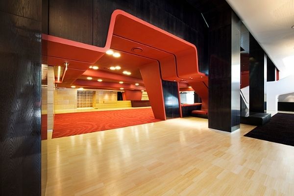The main Auditorium showcases Mirotone’s wood coatings with MIROSTAIN in honeycake over hoop pine, topcoated with MIROTHANE PU clear polyurethane topcoat. The Salon has hoop pine feature walls stained with MIROSTAIN limed white and brown stain, topcoated in MIROTHANE PU Clear Satin Polyurethane Topcoat. The foyer features MIROSTAIN red and black stains topcoated MIROTHANE PU clear, high gloss polyurethane topcoat. The entry on level 1 showcases MIROTHANE PU bright red, black and white high gloss polyurethane topcoats.