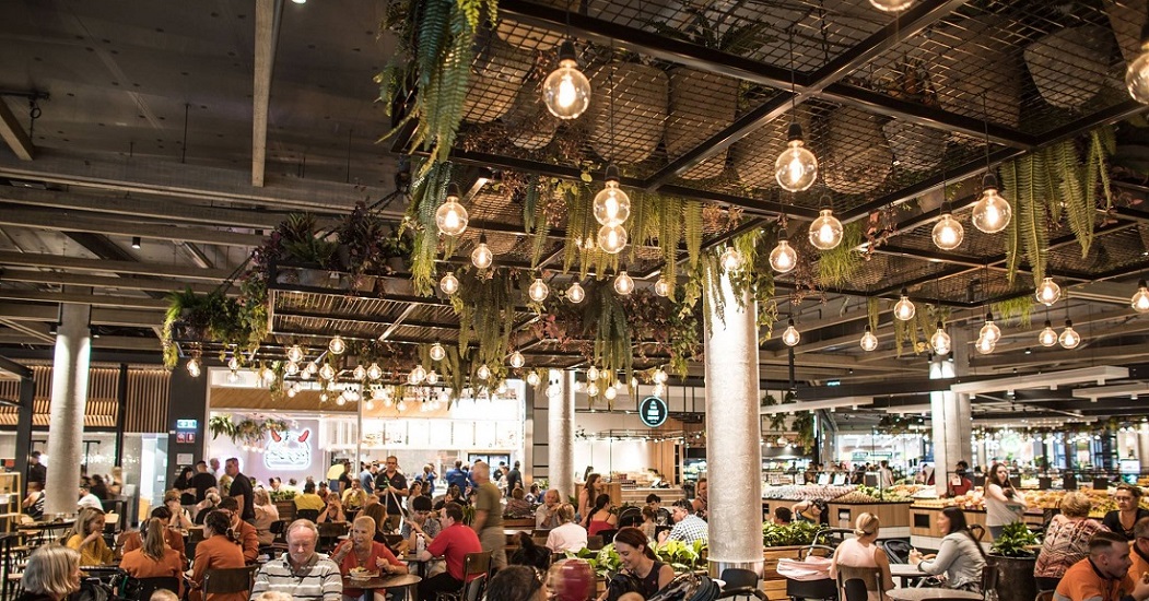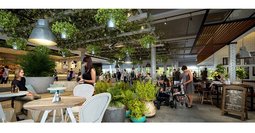 The shopping centre began as a blank canvas of ideas and was reimagined as a social infrastructure within the community. The idea was to create extraordinary places to connect and enrich the community through greenery, design and colour concepts. Natural stone, beachy tones and cool greys were used throughout the complex to achieve this.